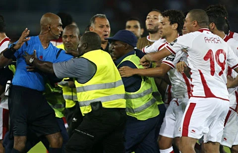 Kết thúc trận đấu, cảnh sát phải áp tải bảo vệ trọng tài này rời sân trước sự phẫn nộ của cầu thủ Tunisia đòi ăn thua đủ với ông đến tận phòng thay đồ.