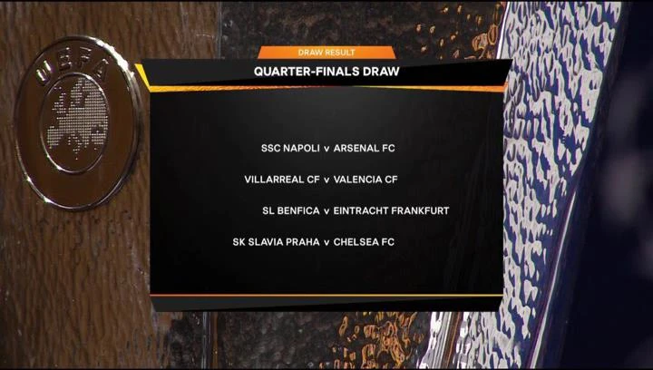 Kết quả bốc thăm vừa kết thúc cách đây ít phút, bốn cặp đấu tứ kết như sau Napoli đấu Arsenal; Villarreal gặp Valencia; Benfica đối đầu Eintracht Frankfurt; Slavia Prague đụng Chelsea.
