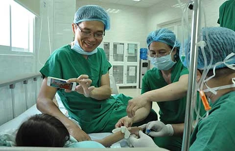Dù đã có nhiều kinh nghiệm trong vi phẫu nhưng BS Nguyễn Xuân Anh, Trưởng Đơn vị phẫu thuật tạo hình và phẫu thuật bàn tay, BV Sài Gòn ITO - phẫu thuật viên chính của ca mổ, vẫn có cảm giác lo lắng. Theo BS Anh, mặc dù hình ảnh X-quang rất rõ nhưng khi mổ, nếu cảm thấy có đụng chạm ảnh hưởng đến mạch máu nuôi thì ca mổ sẽ dừng ngay tức khắc vì có thể sẽ gây hoại tử và hư bàn tay của bé.