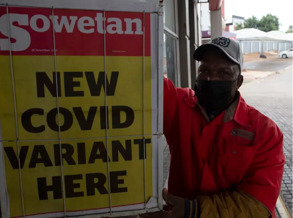 Một nhân viên trạm xăng đứng cạnh một tấm biển giới thiệu nội dung trang chính của một tờ báo ở Nam Phi, ngày 27-11. Tấm biển có nghĩa: Nơi đây có biến thể mới của COVID-19. Ảnh: AP