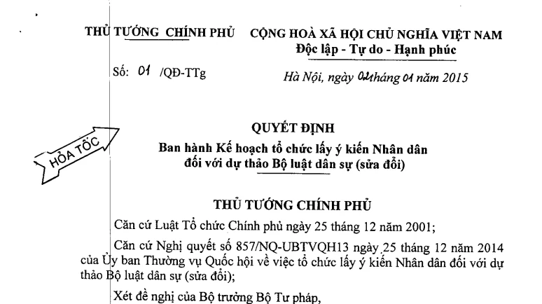 Quyết định nêu rõ, việc tổ chức lấy ý kiến Nhân dân đối với dự thảo Bộ luật dân sự (sửa đổi) phải bám sát nội dung Nghị quyết số 857/NQ-UBTVQH13 và đây cũng phải được coi là một nhiệm vụ trọng tâm cần được ưu tiên tập trung chỉ đạo thực hiện trong Quý I năm 2015.