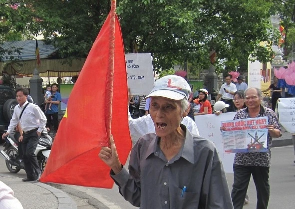Ông Hồ Tấn Phan (cầm lá cờ tổ quốc) mít tinh phản đối hành vi ngang ngược của Trung Quốc trên biển Đông. Ảnh: VIẾT LONG