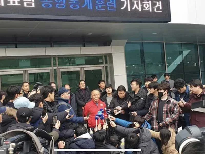 HLV Park Hang-seo được báo chí vây kín phỏng vấn hơn 30 phút ngay tại nơi ông cùng U-23 Việt Nam tập huấn. Ảnh: VFF