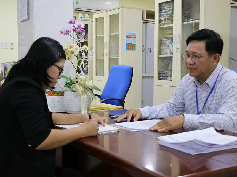 Ông Trần Văn Phước (Trưởng Phòng Tư pháp quận 10) trao đổi với PV. Ảnh: KP