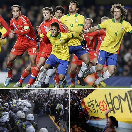 Chỉ hơn một ngày trước trận khai mạc của chủ nhà Brazil và Croatia (3 giờ sáng giờ VN ngày 13-6), ngay thời điểm Chủ tịch FIFA Sepp Blater đọc diễn văn mời gọi người dân Brazil ủng hộ World Cup thì bên ngoài có một cuộc đụng độ giữa công nhân đường sắt và cảnh sát. Hơi cay, vòi rồng và dùi cui giáng tới tấp vào đoàn người biểu tình. Giao thông trên đường phố Sao Paulo tê liệt thảm hại. Biểu ngữ sặc mùi kích động: “FIFA biến đi!”…