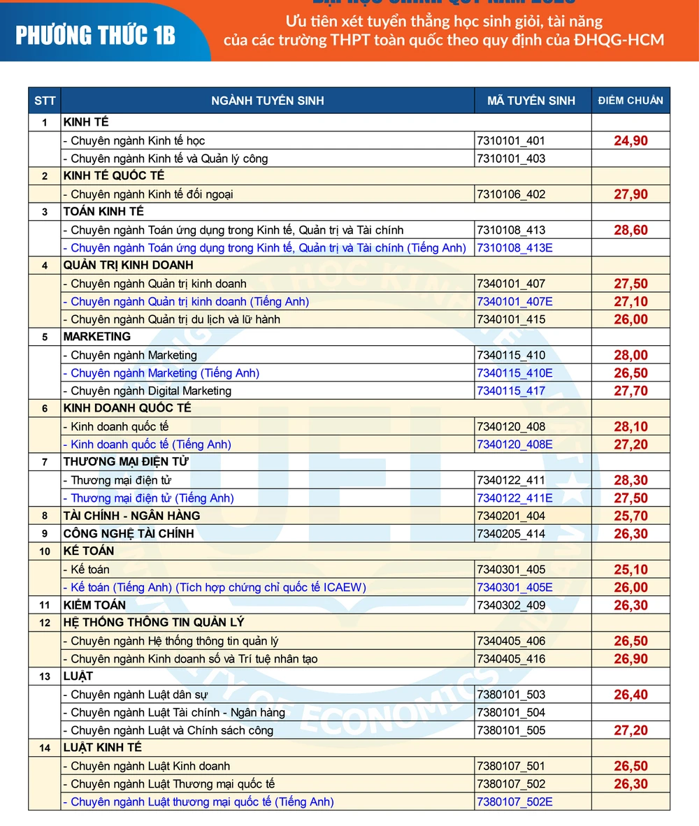 Cụ thể, tại Trường ĐH Kinh tế Luật, trường nhận được hồ sơ từ 159 trường THPT trong cả nước đăng ký xét tuyển phương thức này. Ngành có điểm chuẩn cao nhất theo phương thức này là Toán Kinh tế với 28,60 điểm (thang điểm 30). Các ngành còn lại cũng phải từ gần 25 điểm trở lên mới trúng tuyển.