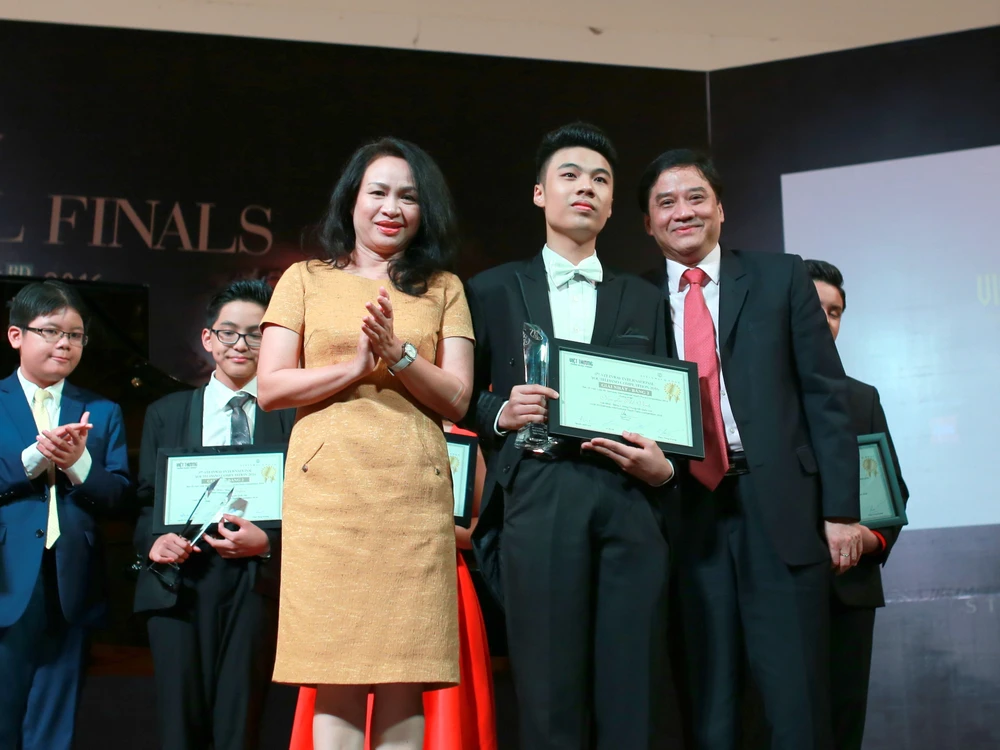 Nguyễn Thế Vinh (giữa) nhận giải thưởng quán quân tại cuộc thi tìm gương mặt đại diện Việt Nam ở Steinway International Youth Piano Competition 2016.