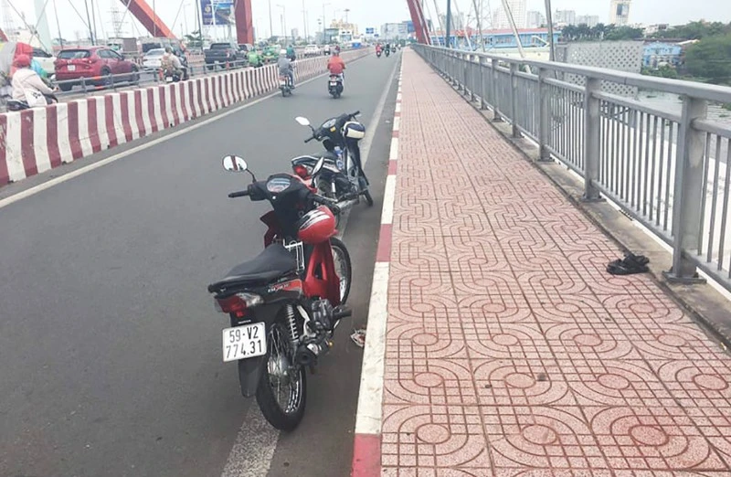 Ngày 4-4, một người phụ nữ chạy xe máy lên giữa cầu Bình Lợi, quận Bình Thạnh (TP.HCM) rồi leo qua lan can nhảy xuống sông Sài Gòn mất tích, để lại chiếc xe máy trên cầu. Ảnh: ĐC