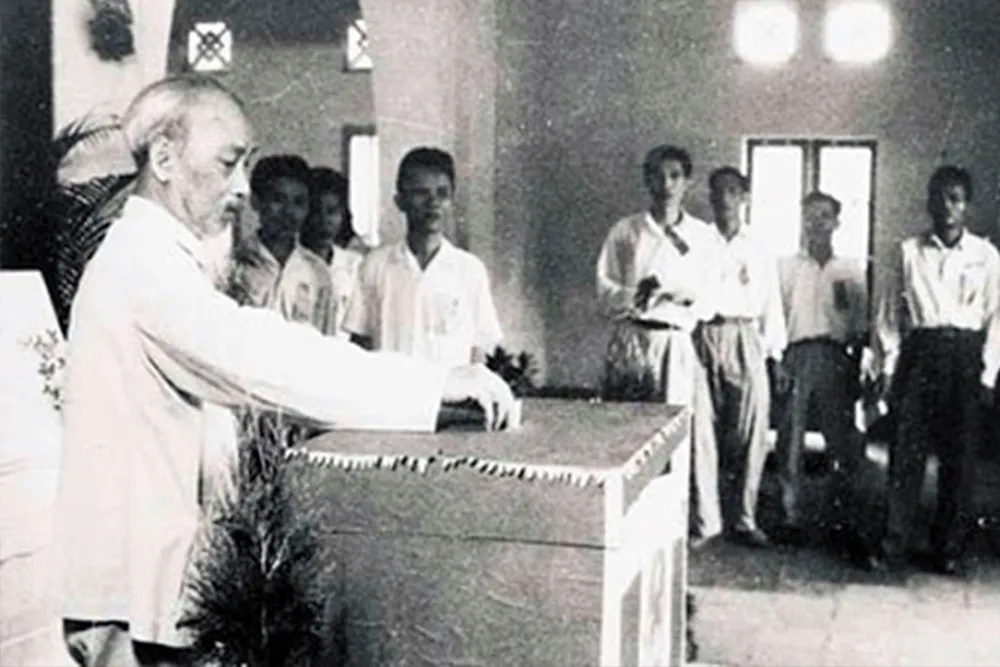 Chủ tịch Hồ Chí Minh đi bỏ phiếu bầu cử tại nhà số 10 phố Hàng Vôi (nay là phố Lý Thái Tổ), Hà Nội. Ảnh: Tư liệu