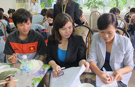 Tuyển thủ nữ Minh Nguyệt (bìa trái) đang giúp các chuyên gia dinh dưỡng thực hiện khảo sát về dinh dưỡng. Ảnh: CH.DỊU