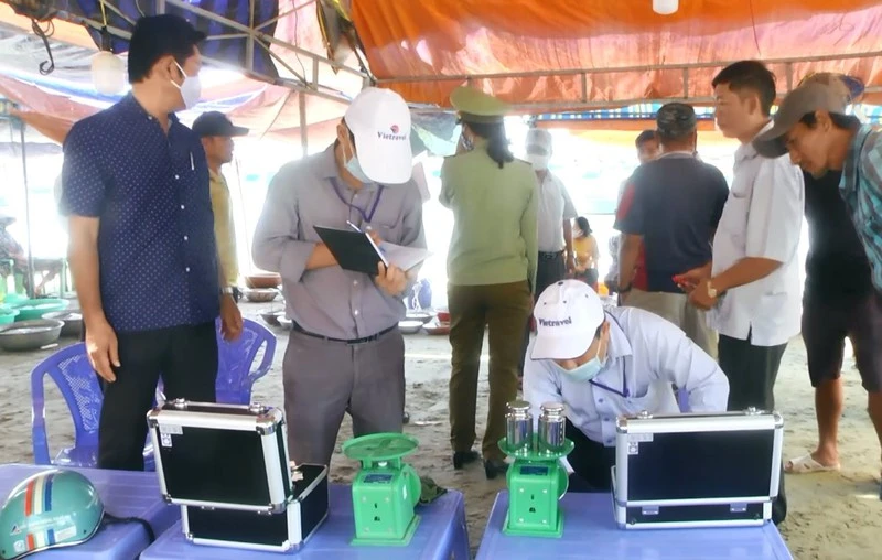 Đoàn kiểm tra đang kiểm tra, đối chiếu các cân bán hải sản. Ảnh: PHƯƠNG NAM