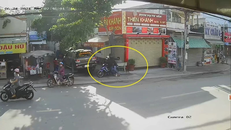 Lúc này, văn phòng chưa mở cửa, ông K. ngồi lên ghế đá một bên văn phòng thì bất ngờ hai thanh niên đi xe máy tới, áp sát. Người ngồi sau với tay giật sợi dây chuyền của ông. Diễn biến được camera an ninh ghi lại.