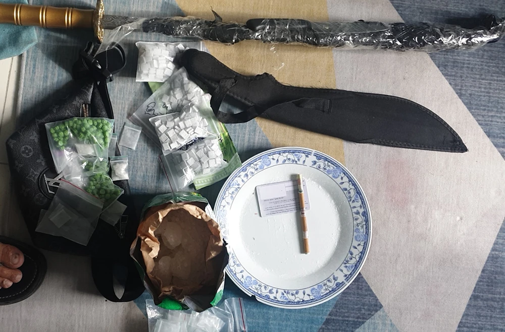 Kiểm tra nhà Kiên và một căn hộ khác, cảnh sát tìm thấy tổng cộng 2,3 kg ma tuý, nhiều hung khí và tang vật liên quan.