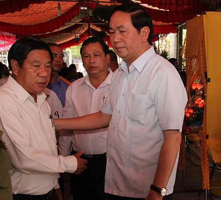Đại tướng Trần Đại Quang, Bộ trưởng Bộ Công an (phải) đang trao đổi với ông Nguyễn Tấn Hưng, Bí thư Tỉnh ủy Bình Phước, về vụ thảm sát. Ảnh: N.ĐỨC