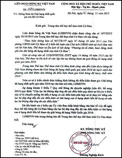 Nhưng cuối cùng khi ông Võ Quốc Thắng giúp Cà Mau tháo gỡ được thì lại gặp công văn của VFF “ấn” xuống.