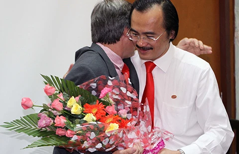 Trong khi Chủ tịch HĐQT VPF Võ Quốc Thắng (phải) xuống tận Cà Mau tìm cách giải gỡ khúc mắc và giúp CLB này thi đấu thì VFF nhanh nhảu ra công văn tìm đội thay thế mà không cần tìm hiểu. Ảnh: XUÂN HUY