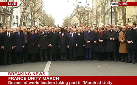 Lãnh đạo các nước đã đến địa điểm tuần hành, khoát tay nhau thể hiện sự đoàn kết. Nổi bật có sự tham gia của các lãnh đạo hàng đầu châu Âu như Francois Hollande (Tổng thống Pháp), Matteo Renzi (Thủ tướng Ý), Mariano Rajoy (Thủ tướng Ý), Angela Merkel (Thủ tướng Đức), David Cameron (Thủ tướng Anh), Ahmet Davutoglu (Thủ tướng Thổ Nhĩ Kỳ), ...