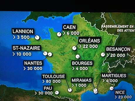 Trong khi đó, tại hàng loạt các thành phố khác của Pháp, những cuộc tuần hành tự phát với mục đích tương tự đã được tập hợp, dự kiến sẽ được tiến hành cùng lúc với cuộc tuần hành tại Paris. Tạo nên một cuộc tuần hành trên quy mô toàn nước Pháp.