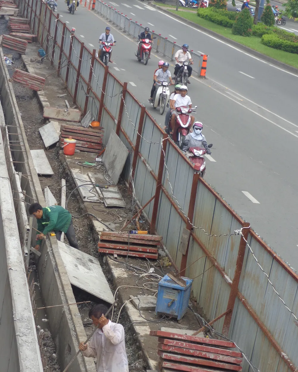 Mương thoát nước bên hông nhánh rẽ được khẩn trương hoàn thiện, trong khi lưu thông bên ngoài rào chắn trên đường Võ Văn Kiệt vẫn được bảo đảm.