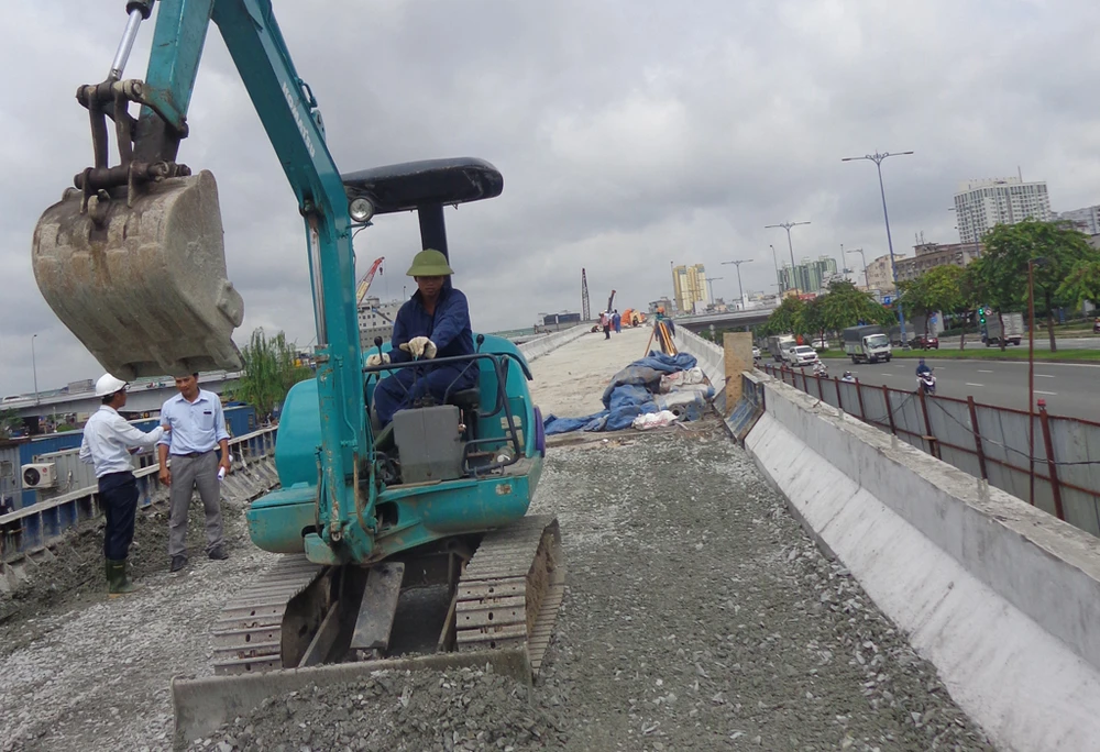Ở đầu dưới, nơi tiếp giáp giữa nhánh rẽ và đường Võ Văn Kiệt, mặt đường dẫn xuống đang được đổ đá, lu lèn để chuẩn bị cho các công đoạn đổ bê tông xi măng và lớp bê tông nhựa nóng trên cùng.
