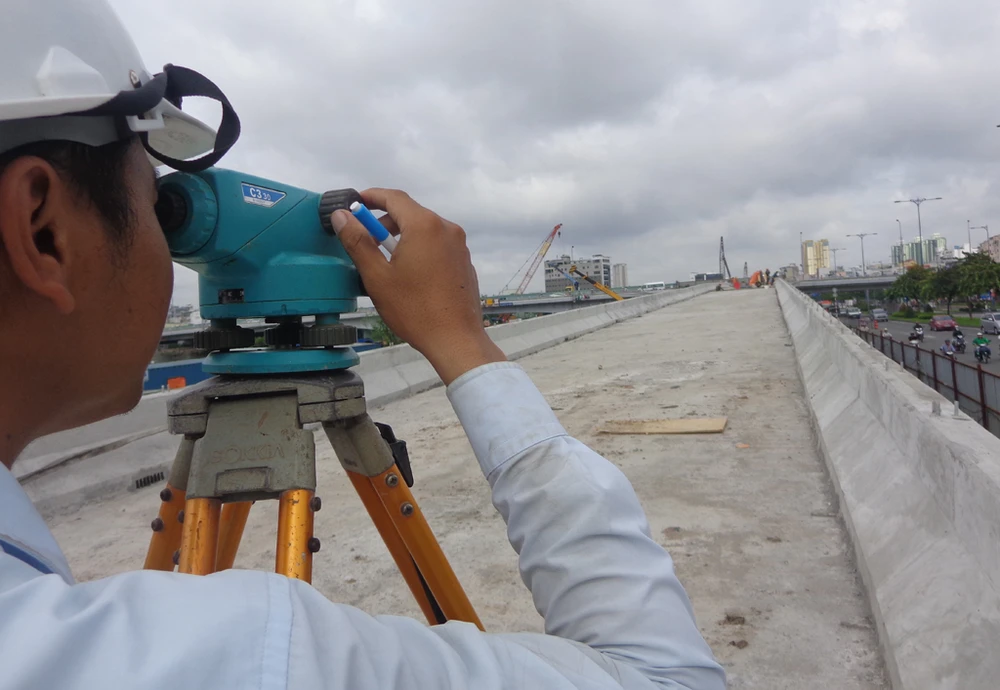 Kỹ sư đo đạc, kiểm tra lại các thông số trên mặt cầu nhánh rẽ để chuẩn bị cho việc đổ bê tông nhựa nóng.