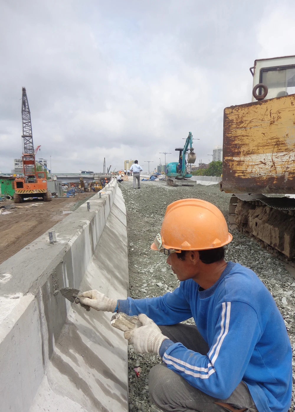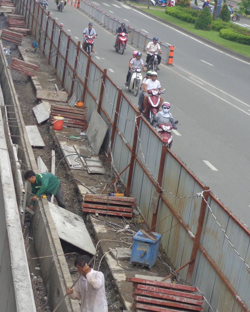 Công nhân hoàn thiện tường chắn ở đầu đường nhánh rẽ dẫn xuống đường Võ Văn Kiệt.