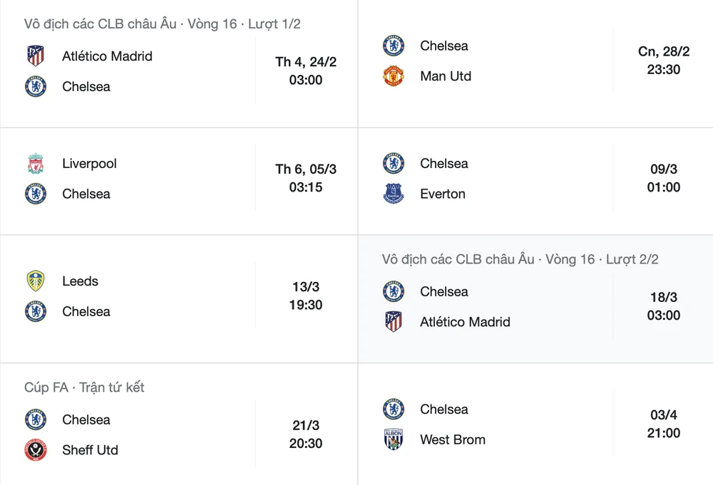 Cụ thể vào ngày 24-2, Chelsea sẽ có chuyến hành quân đến sân của Atletico Madrid để đá trận lượt đi vòng 16 đội Champions League. Cũng trong tuần thi đấu này vào ngày chủ nhật 28-2, Chelsea sẽ tiếp đón MU trên sân nhà Stamford Brigde tại vòng 26 Premier League. Ở trận lượt đi trên sân Old Trafford của MU, Chelsea có kết quả hoà 0-0 với thầy trò HLV Solskjaer.