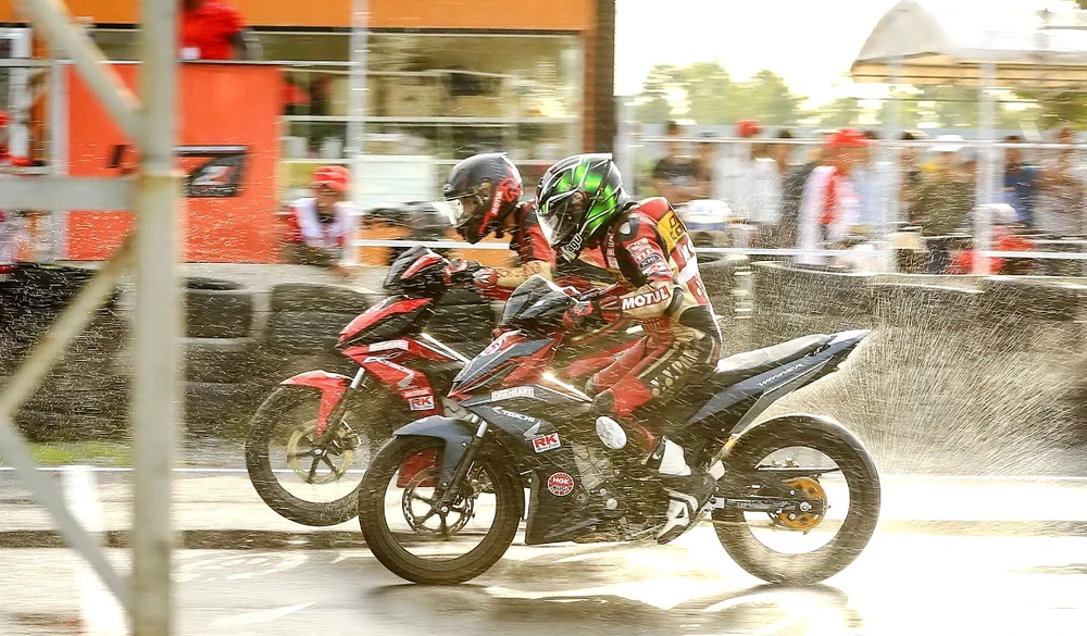 Bất chấp mưa gió, các tay đua tranh nhau từng khúc cua