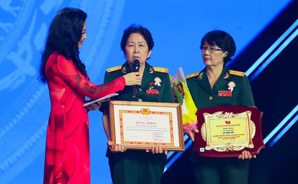 Gia đình Đại tá Lê Kim Hà (giữa) được tuyên dương là "Gia đình truyền thống lực lượng vũ trang tiêu biểu 2020". Tại buổi lễ, bà chia sẻ về tình cảm gia đình giữa các thành viên, đặc biệt là người mẹ đã tần tảo hy sinh cho anh chị em bà.