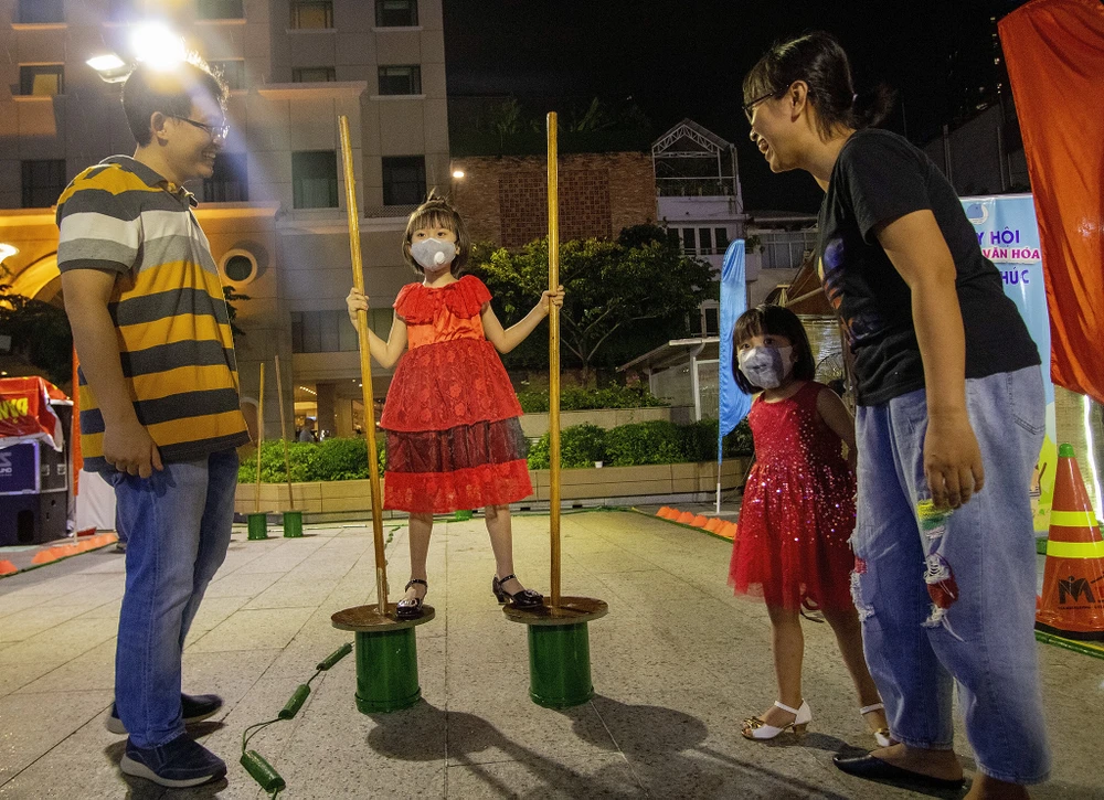 Bên cạnh đó còn có các trò chơi tạo sự gắn kết, chia sẻ. Hai vợ chồng anh Đinh Kim Nghĩa và chị Trần Thị Việt Hà (quận 3, TP.HCM) cùng con chơi trò chơi dân gian.\