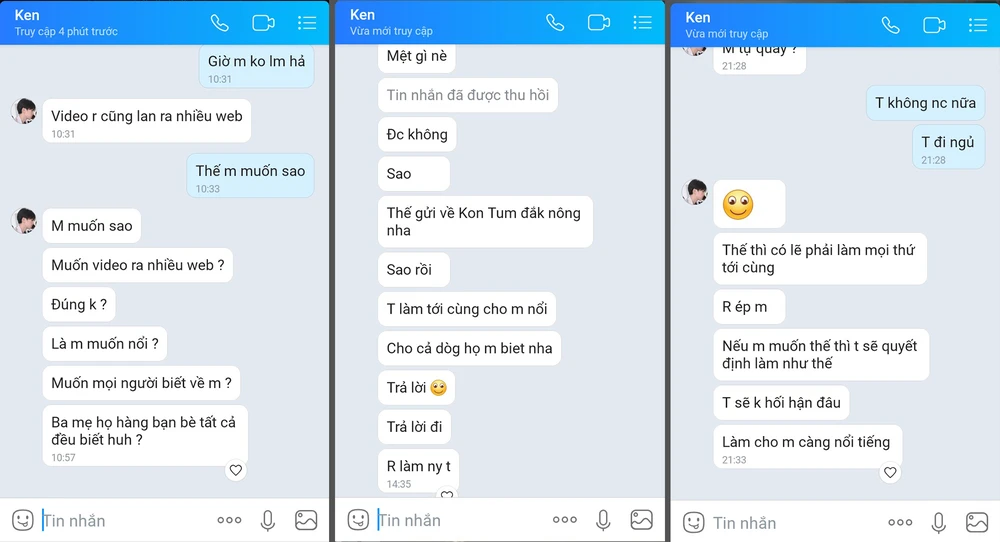 Nhiều đoạn tin nhắn đe doạ sẽ gửi clip cho gia đình và tiếp tục tung video lên mạng của Nguyên gửi cho nạn nhân. Ảnh: NGUYỄN YÊN