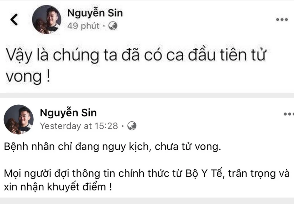 Cụ thể, vào 13 giờ 53 phút ngày 28-3, tài khoản Facebook Nguyễn Sin đã đăng tải thông tin: “Vậy là chúng ta đã có ca đầu tiên tử vong!”. Dòng trạng thái (status) này sau hơn 30 phút đã thu hút hơn 14.000 lượt like, hơn 1.600 lượt chia sẻ (share).