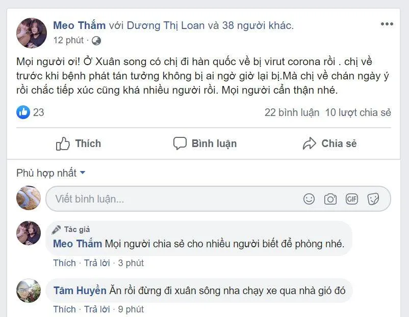 Tối 27-2, bà đăng thông tin: Ở Xuân Song có chị đi Hàn Quốc về bị virus Corona rồi.
