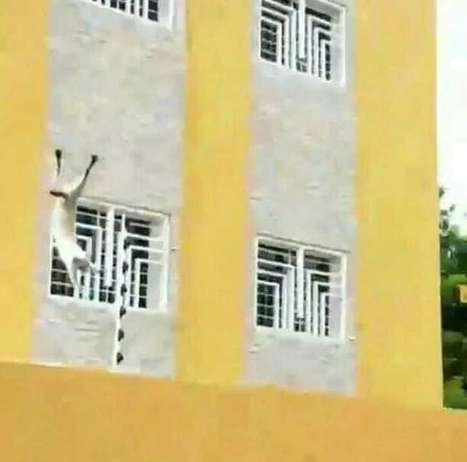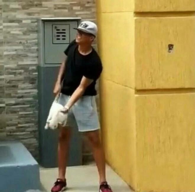 Con mèo bị quăng từ trên cao xuống đất.