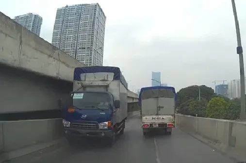 Vào thời điểm trên, chiếc xe tải biển số 19C-024.69 đang lưu thông theo hướng Khuất Duy Tiến - Phạm Hùng thì bất ngờ quay đầu đi ngược chiều. Mặc cho dòng xe đang nối đuôi nhau từ đường trên cao để xuống đường bên dưới, tài xế xe tải vẫn bất chấp nguy hiểm, điều khiển xe tới khu vực cầu cạn rồi “bò” ngược chiều lên đường trên cao.