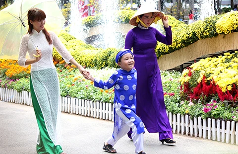 Năm nay, sự trở lại của áo dài Việt lại nhờ các bạn trẻ. Những cô gái tuổi teen trong trang phục áo dài truyền thống dạo chơi cùng cha mẹ trên đường sách. Các thiếu nữ thướt tha áo dài dọc đường đi bộ Nguyễn Huệ, hội hoa xuân Tào Đàn... trở thành nét đẹp đẫm sắc xuân của Sài Gòn tết Bính Thân này. Rủ nhau đi chùa đầu năm trong chiếc áo dài trở thành mốt của giới trẻ năm nay.
