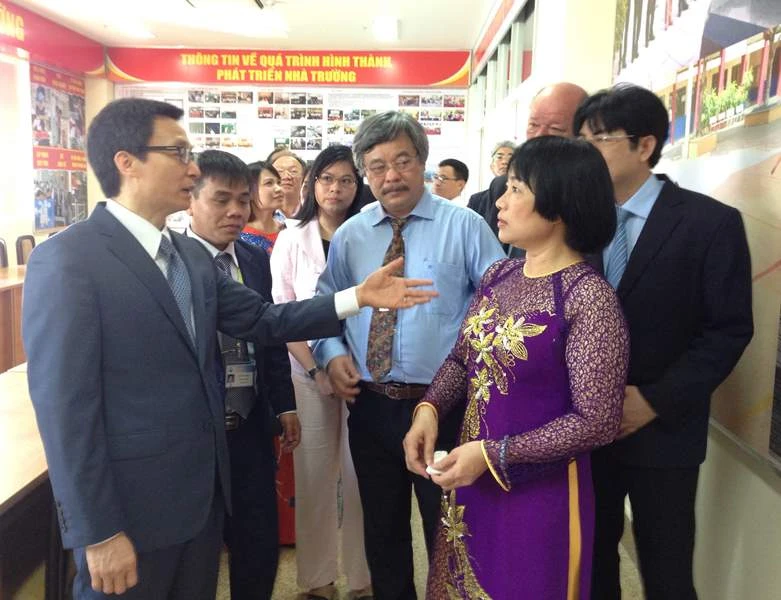 Phó Thủ tướng Vũ Đức Đam trao đổi với lãnh đạo Trường CĐ Kỹ nghệ II về hoạt động tự chủ, có đem lại hiệu quả. Ảnh: P.ĐIỀN