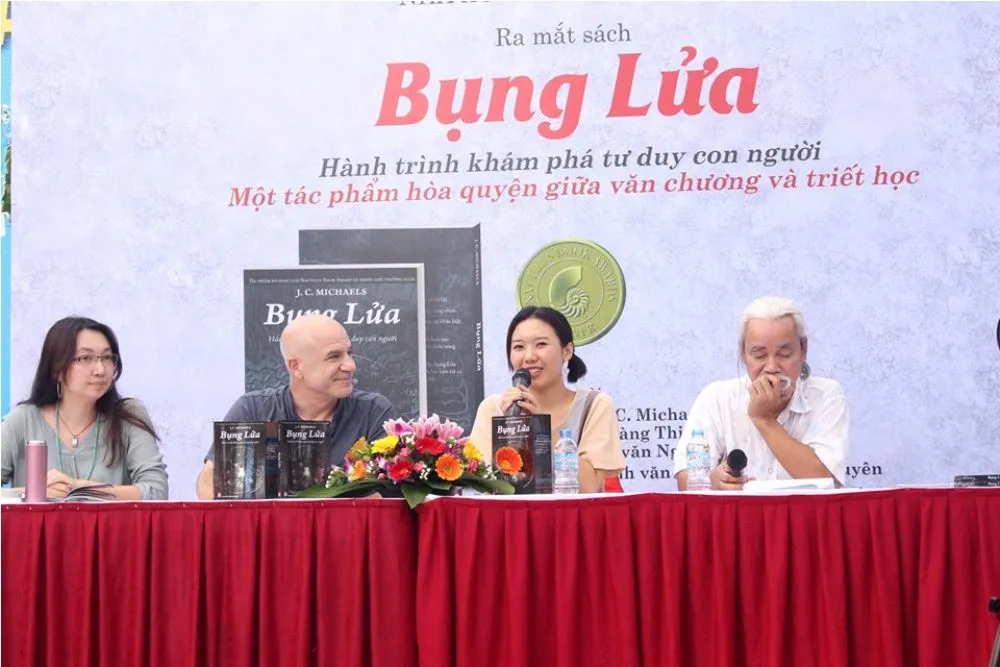 Dịch giả Hoàng Thị Thùy và Nhà văn Mỹ J. C. Michaels chia sẻ tại buổi ra mắt.