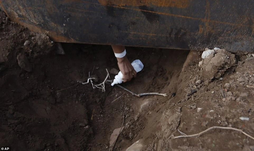 Joel Mendez đưa con qua cái lỗ vừa mới đào được. Ảnh: AP