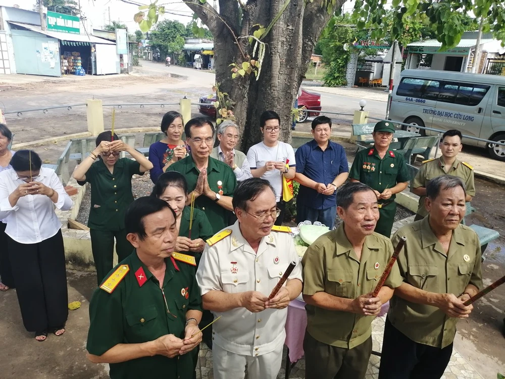 Đoàn thắp nén hương tưởng niệm 6 chiến sĩ đặc công hi sinh tại Gò Trung An. Ảnh: HL