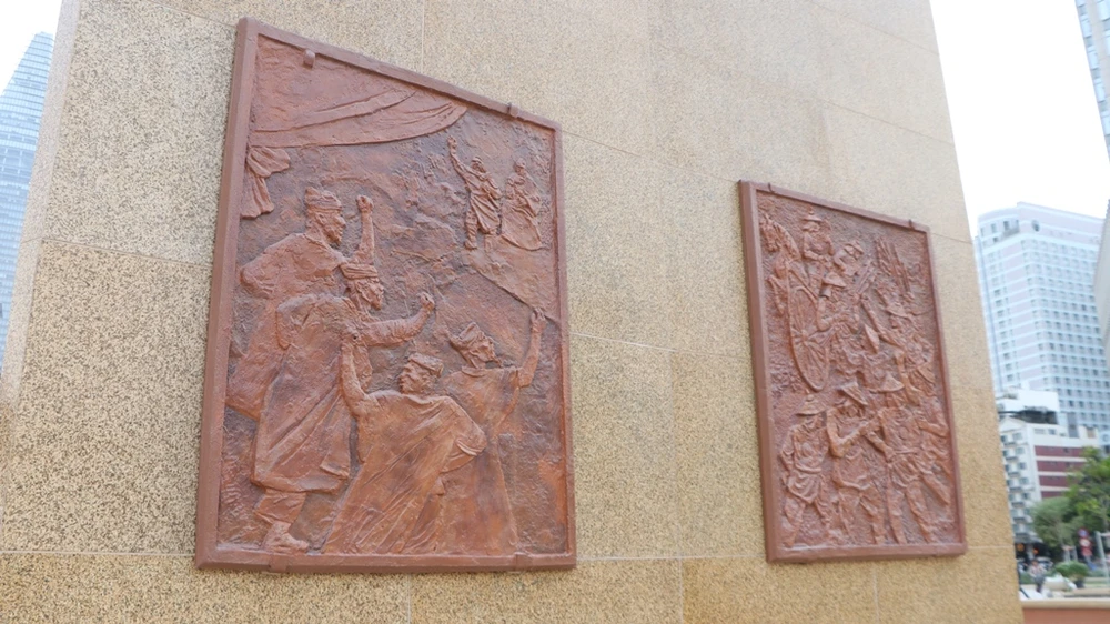 Ba mặt của bệ có sáu bức phù điêu mô tả các trận tiêu diệt giặc ngoại xâm cũng được khôi phục.