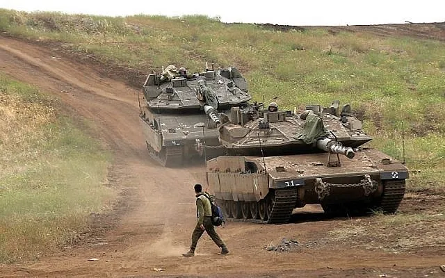 Binh sĩ Israel cạnh xe tăng Merkava Mark IV ở cao nguyên Golan trong một cuộc tập trận quân sự năm 2018. Ảnh: Jalaa Marey/AFP