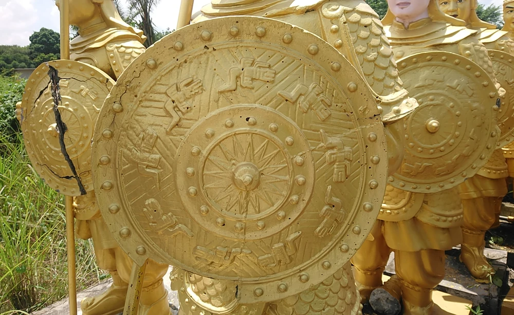 Ông Dũng cho rằng những tượng lính này được đúc bằng bê tông, hoa văn trên tấm khiên phác họa từ hoa văn trống đồng của Việt Nam. Ảnh: LÊ ÁNH