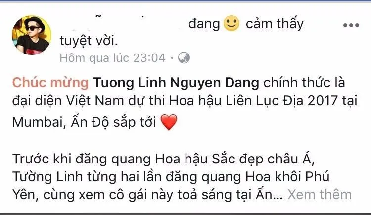 Tường Linh xác nhận thông tin cô sẽ đại diện Việt Nam tham dự Hoa hậu Liên lục địa thế giới 2017 trên Facebook cá nhân. (Ảnh chụp từ Facebook của Tường Linh)