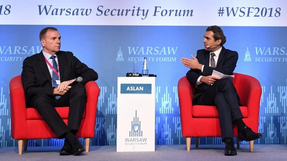 Cựu tướng Mỹ Ben Hodges (trái) tại Diễn đàn an ninh Warsaw ở Ba Lan. Ảnh: EPA