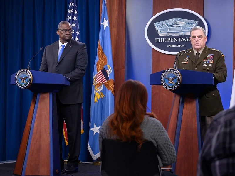 Bộ trưởng Quốc phòng Mỹ Lloyd Austin (trái) và Chủ tịch Hội đồng Tham mưu trưởng Liên quân Mỹ Mark Milley (phải) trong cuộc họp báo hôm 21-7. Ảnh: LẦU NĂM GÓC
