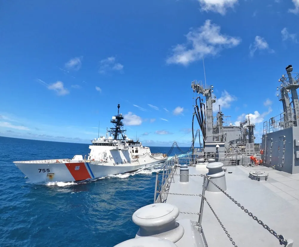 Tàu JS OUMI của Nhật huấn luyện chung với tàu tuần duyên USCGC Munro của Mỹ ở biển Hoa Đông ngày 26-8. Ảnh: JMSDF