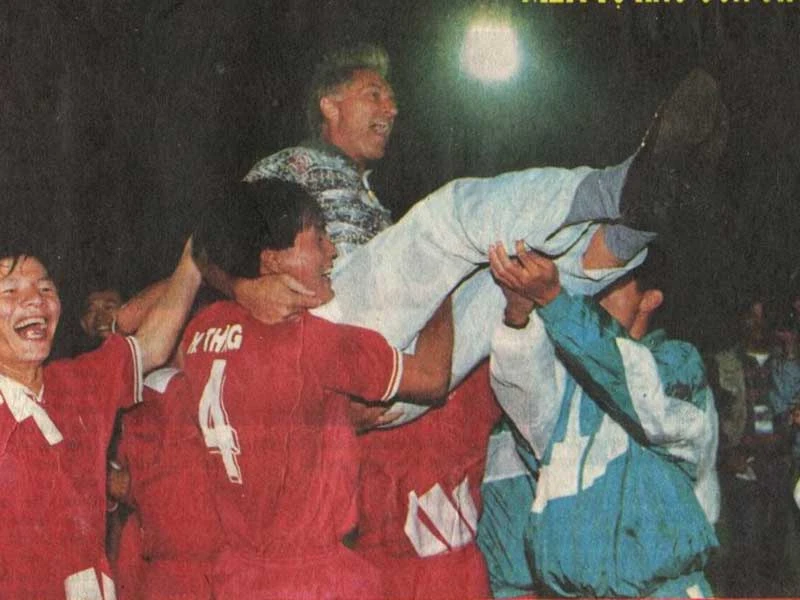 Học trò Hữu Thắng cùng các đồng đội tung hô thầy Weigang tại SEA Games 18 (1995) ở Chiang Mai. Ảnh: TƯ LIỆU