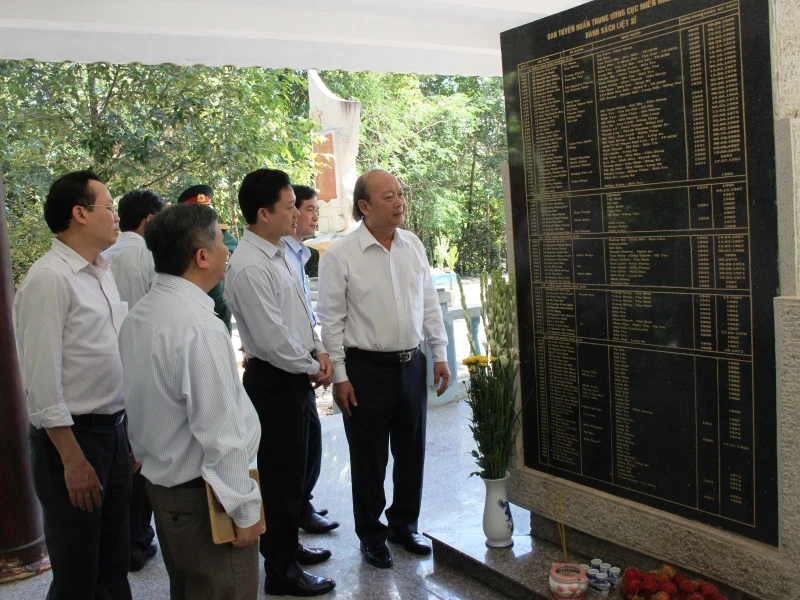 Đoàn đại biểu thăm bia ghi danh các anh hùng liệt sĩ Ban Tuyên huấn Trung ương Cục miền Nam. Ảnh: TTXVN