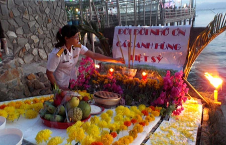 Chuẩn bị thả vòng hoa tưởng niệm các đồng đội hy sinh. Ảnh: C.THI